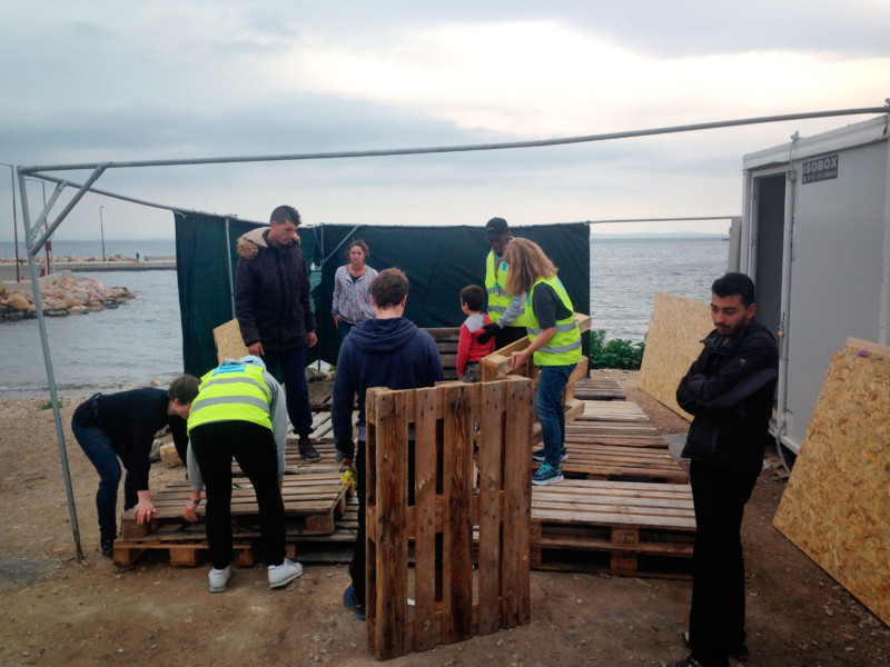 Barn satt på tepper i den varme vårsolen. En av leirens minste beboerne ga sin egen tolkning av breakdance som gjorde ham til en publikumsfavoritt. Lenger bak samlet voksne seg rundt store industrielle piknikbord, familier og grupper av unge menn i fellesskap med lokale aktivister og frivillige fra mange av organisasjonene som arbeider på Chios.